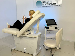 Первое, что видит клиент — кушетка косметологическая, затем рабочее пространство вокруг неё.